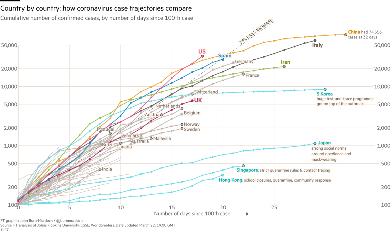 Ασιατικές χώρες όπως η Σιγκαπούρη και του Χονγκ Κονγκ που πήραν πιο αυστηρά μέτρα φαίνεται πως κατάφεραν να έχουν μια πιο αργή εξάπλωση των κρουσμάτων στον πληθυσμό.