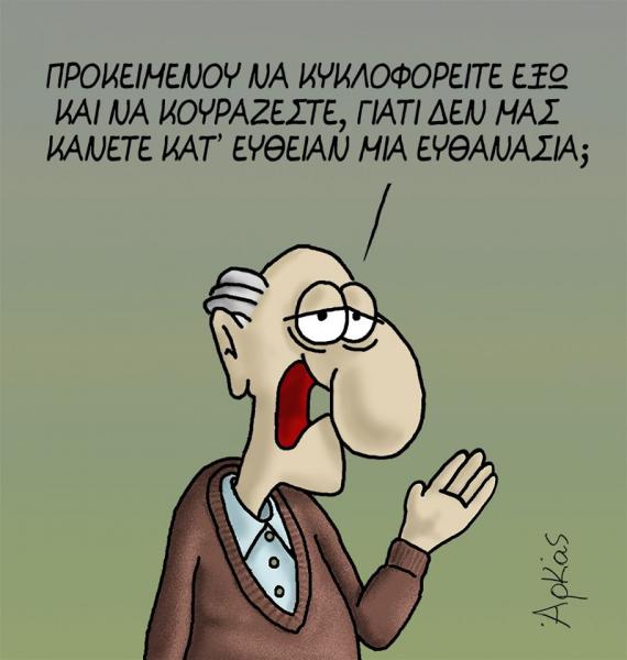 «Προκειμένου να κυκλοφορείτε έξω και να κουράζεστε, γιατί δεν μας κάνετε κατευθείαν μια ευθανασία;» διερωτάται ο σκιτσογράφος.