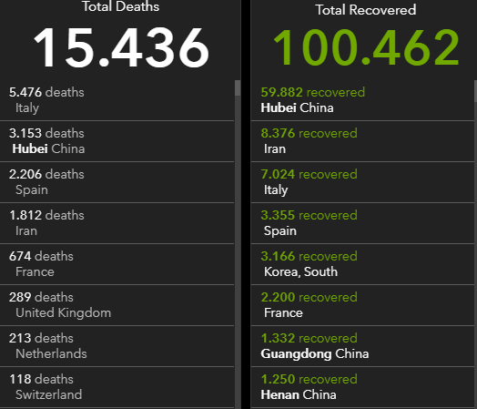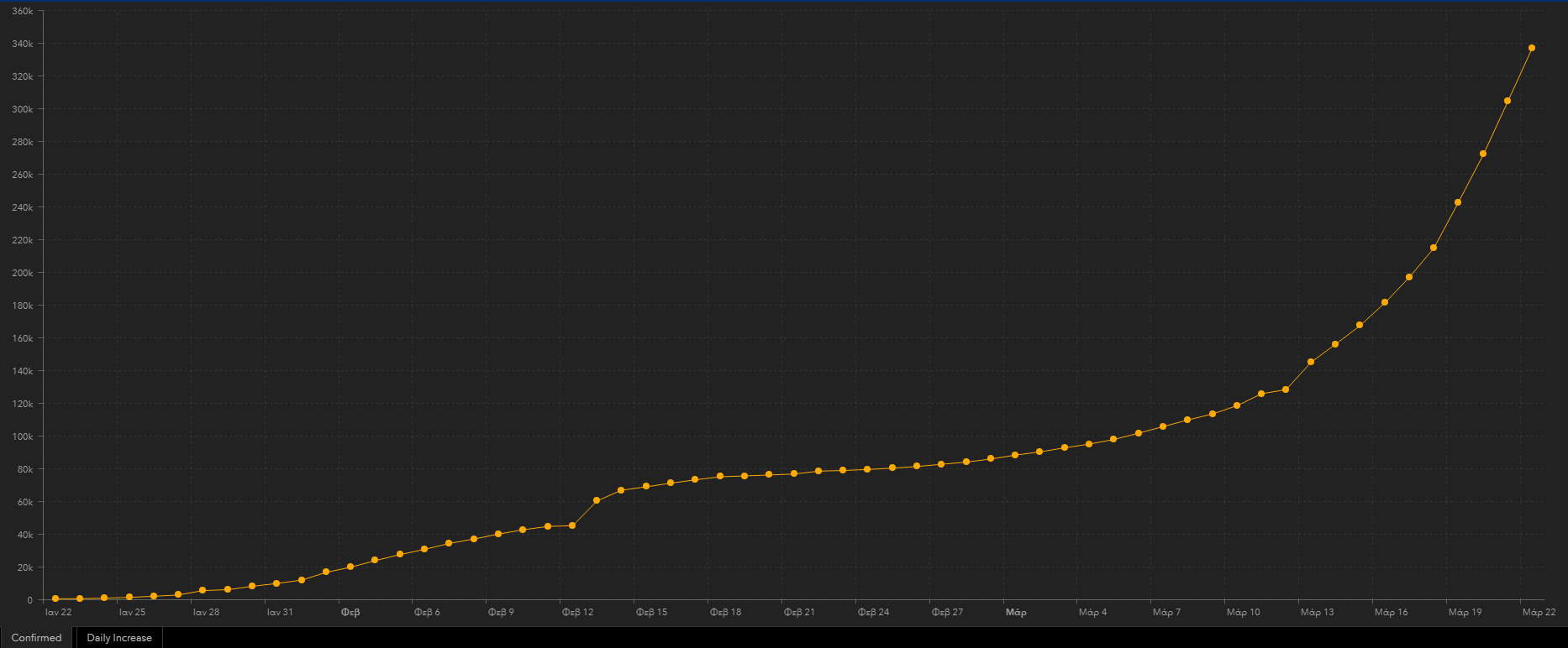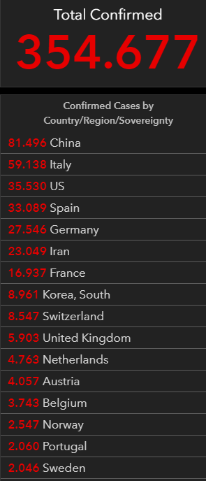 Τα κρούσματα σε παγκόσμια κλίμακα έχουν ξεπεράσει τα 354.600 και συνεχίζουν να αυξάνονται με εκθετικό ρυθμό σε καθημερινή βάση. Την ίδια ώρα η οι νεκροί έχουν ξεπεράσει τους 15.400.