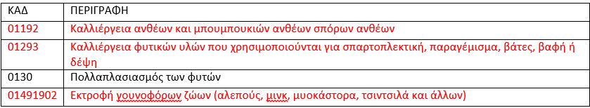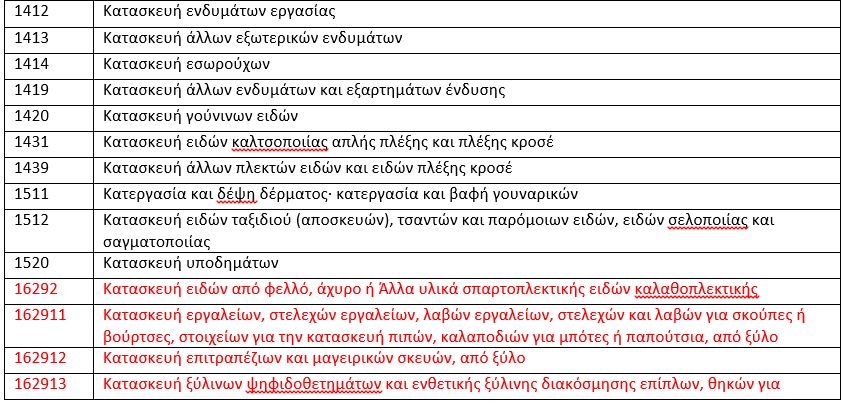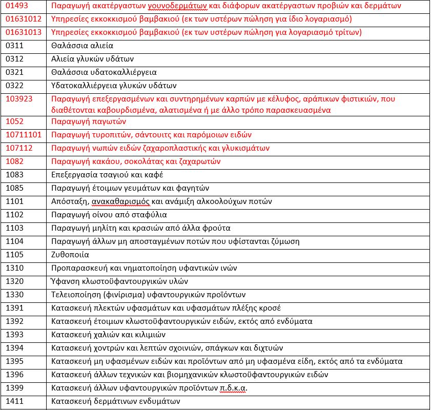 ΚΑΔ που πλήττονται (με κόκκινο χρώμα επισημαίνονται οι κατηγορίες που προστίθενται)