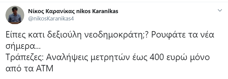 Ο κ. Καρανίκας, με σειρά αναρτήσεων στο twitter έχει προκαλέσει σάλο, αφού δίχως αιδώ συνδέει τα capital control που επέφερε το καταστροφικό πρώτο 6μηνο διακυβέρνησης του ΣΥΡΙΖΑ με τα νέα μέτρα της κυβέρνησης για τις τράπεζες