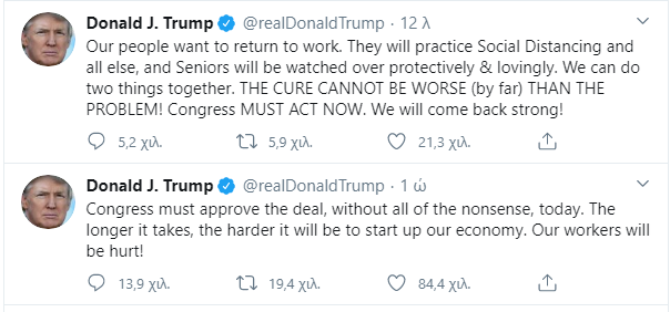 Χαρακτηριστικά είπε: «Το Κογκρέσο πρέπει να δεχτεί το πακέτο-συμφωνία, χωρίς όλες τις ανοησίες, σήμερα. Όσο περισσότερο παίρνει, τόσο πιο δύσκολο θα είναι να ξανα-ξεκινήσουμε την οικονομία μας. Οι εργαζόμενοι θα έχουν προβλήματα».
