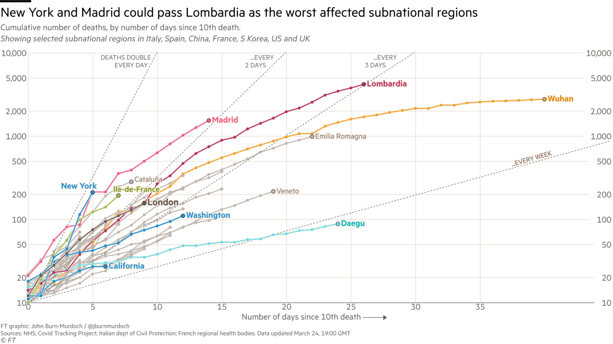 Η καμπύλη για τη Νέα Υόρκη, αν και είναι ακόμα στην αρχή της, έχει μια απίστευτη αυξητική τάση. Στη Νέα Υόρκη μόνο έχουν σημειωθεί μέχρι στιγμής 192 θάνατοι.