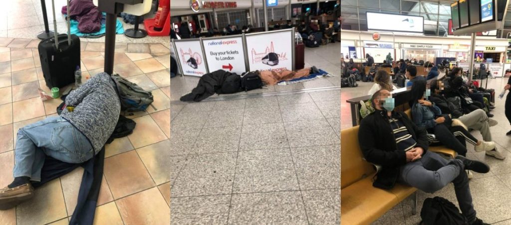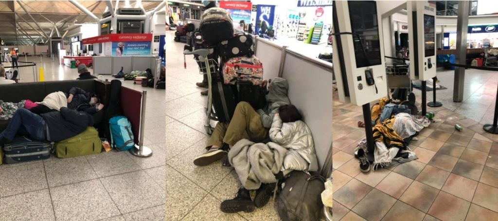 Βρισκόμαστε στο αεροδρόμιο του Στανστεντ από τις 24/3 στη 1 το μεσημέρι όταν οι πτήσεις της Ryanair για Αθήνα και Θεσσαλονίκη ακυρώθηκαν. Εδώ και μέρες δεν έχουμε καμία επίσημη ενημέρωση για το πότε και αν θα πραγματοποιηθούν οι πτήσεις μας. Οι πτήσεις ακυρώθηκαν με απόφαση της κυβέρνησης και ήταν οι τελευταίες πτήσεις που θα πετούσαν μετά την απαγόρευση των πτήσεων. Επικοινώνησα στις 24-3-2020 με το υπουργείο Εξωτερικών και το “Ελευθέριος Βενιζέλος” και με προέτρεψαν να επιλέξω τη συγκεκριμένη πτήση μιας και δεν υπήρχε ακόμα το πλάνο των πτήσεων επαναπατρισμού. Εξακολουθούμε να μην έχουμε καμία επίσημη ενημέρωση για το πότε και αν θα πραγματοποιηθούν οι πτήσεις μας. Έχουμε εξαντληθεί, εν μέσω πανδημίας, είμαστε απόλυτα εκτεθειμένοι σε έναν άμεσο κίνδυνο.