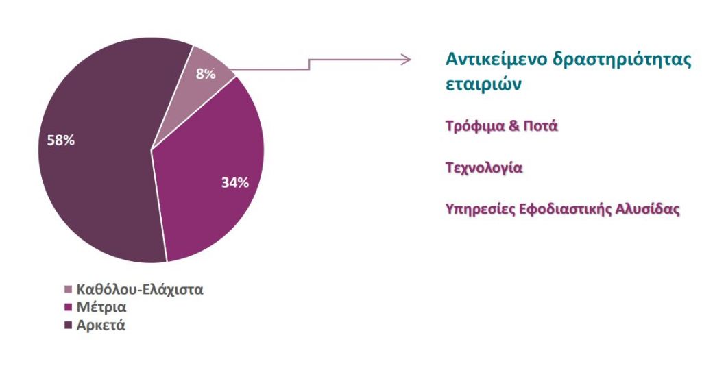 Το υψηλό ποσοστό της τάξεως του 66% αποτυπώνει τη συμμετοχή εταιριών που ανήκουν στον κλάδο των υπηρεσιών, ενώ αντίστοιχα το υπόλοιπο ποσοστό ύψους 34% κατανέμεται στους υπόλοιπους τομείς (βιομηχανικός τομέας, μεταποιητικός τομέας, τομέας λιανικής, πρωτογενής τομέας). Αξίζει να σημειωθεί πως μόλις το 1% των εταιριών έχουν διευρυμένη δραστηριότητα και εντάσσονται σε όλους τους τομείς.