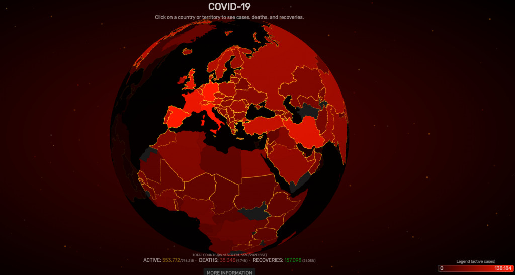 Ο χάρτης αποτυπώνει τον καθημερινό απολογισμό σε κάθε χώρα, με βάση στοιχεία από το worldometers, και ανανεώνεται κάθε δύο λεπτά.