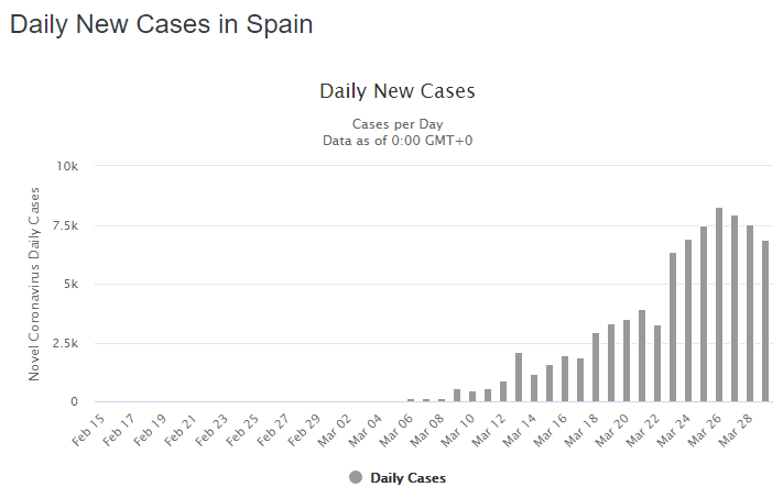 Ο ημερήσιος ρυθμός αύξησης των κρουσμάτων και των θανάτων επιβραδύνεται συνεχώς από τα μέσα της περασμένης εβδομάδας στην Ισπανία, όπου οι υγειονομικές αρχές ελπίζουν ότι η κορύφωση της επιδημίας είναι κοντά.