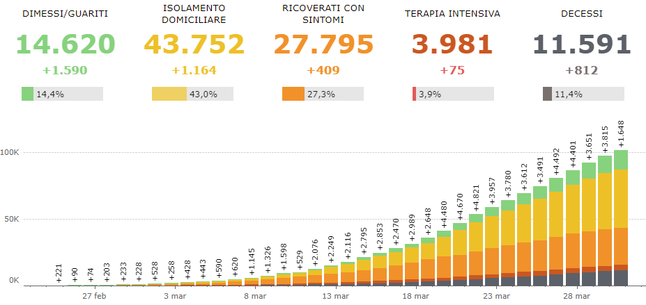 Με 11.591 νεκρούς, η Ιταλία παραμένει η χώρα με τα περισσότερα θύματα στον κόσμο. Ακολουθούν η Ισπανία (7.340 νεκροί) και η Κίνα (3.304), απ’ όπου ξεκίνησε η πανδημία στα τέλη Δεκεμβρίου 2019.