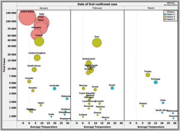 «Εντοπίσαμε μια σαφή επίδραση της θερμοκρασίας στο ρυθμό εξάπλωσης της νόσου, καθώς οι χώρες με χαμηλότερες θερμοκρασίες και ιδιαίτερα με μέσες τιμές 0-18 βαθμών Κελσίου εμφανίζουν ταχύτερα μεγαλύτερο αριθμό νέων κρουσμάτων COVID-19 ανά ημέρα, και μεγαλύτερο συνολικό αριθμό επιβεβαιωμένων κρουσμάτων, σε σύγκριση με τις χώρες με υψηλότερη μέση θερμοκρασία. Σύμφωνα με τις αναλύσεις μας η επίδραση της θερμοκρασίας φαίνεται να είναι ανεξάρτητη από το χρόνο εκδήλωσης του πρώτου κρούσματος και της πυκνότητας του πληθυσμού. Φυσικά στον τελικό αριθμό των κρουσμάτων πρωτεύοντα ρόλο παίζει η λήψη μέτρων πρόληψης της διάδοσης του ιού και τα συστήματα καταγραφής κρουσμάτων της κάθε χώρας, τα οποία θα πρέπει να συνυπολογιστούν» ανέφερε με δηλώσεις του δήλωσε ο καθηγητής Πνευμονολογίας, Κωνσταντίνος Γουργουλιάνης.