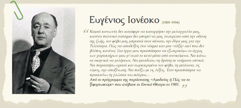 «Και σ’ αυτό το σημείο βρίσκουμε την απομυθοποιητική ματιά και την κοινωνική κριτική του κατά τ’ άλλα απολιτικού Ιονέσκο.