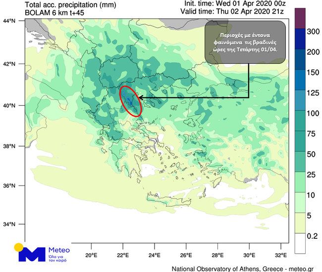 Σύμφωνα με τα διαθέσιμα προγνωστικά στοιχεία του Εθνικού Αστεροσκοπείου Αθηνών / meteo.gr, οι βροχές που εκδηλώνονται από τις πρωινές ώρες της Τετάρτης 01/04 στα δυτικά και βόρεια, κατά τη διάρκεια της ημέρας θα ενταθούν και θα επεκταθούν ανατολικά. Τοπικά έντονα φαινόμενα αναμένονται από το μεσημέρι στη Μακεδονία και το Βόρειο Αιγαίο. Κατά τη διάρκεια της νύχτας έως τις πρώτες πρωινές ώρες της Πέμπτης 02/04, τα φαινόμενα θα επηρεάσουν και τα νησιά του Ανατολικού Αιγαίου. Στο Χάρτη 1, απεικονίζεται το αθροιστικό ύψος βροχής κατά τη διάρκεια του διημέρου της κακοκαιρίας (από το πρωί της Τετάρτης 01/04 έως το βράδυ της Πέμπτης 02/04), καθώς επίσης οι περιοχές όπου αναμένονται τα έντονα φαινόμενα.