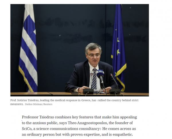 Στο δημοσίευμα γίνεται αναφορά στον πρωταγωνιστικό ρόλο, του Σωτήρη Τσιόδρα στο να πάρει η Ελλάδα μερικά από τα πιο εγκαίρως ληφθέντα περιοριστικά μέτρα στην Ευρώπη, «κάτι που φαίνεται να αποδίδει, καθώς η Ελλάδα μετρά από την αρχή της κρίσης μόλις 68 θανάτους» (σ.σ 73 με βάση τον τελευταίο απολογισμό το απόγευμα της Κυριακής). Αντίθετα, το Βέλγιο, με ανάλογο πληθυσμό, μετρά 1.283 θανάτους.