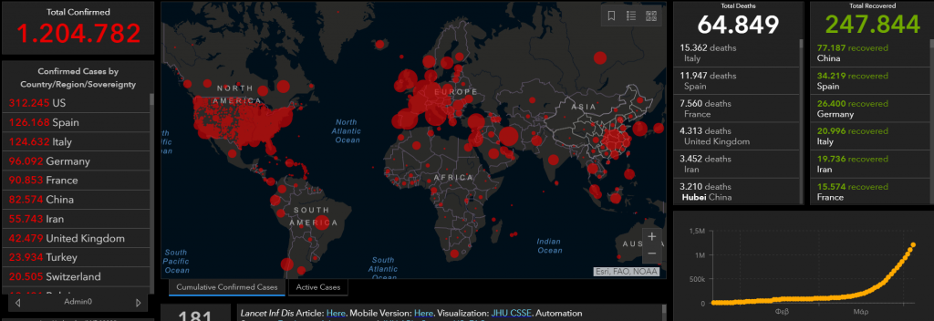 Σύμφωνα με το πανεπιστήμιο Johns Hopkins, τα επιβεβαιωμένα κρούσματα παγκοσμίως είναι 1.204.782, ενώ οι θάνατοι 64.849, την στιγμή που 247.844 έχουν αναρρώσει.