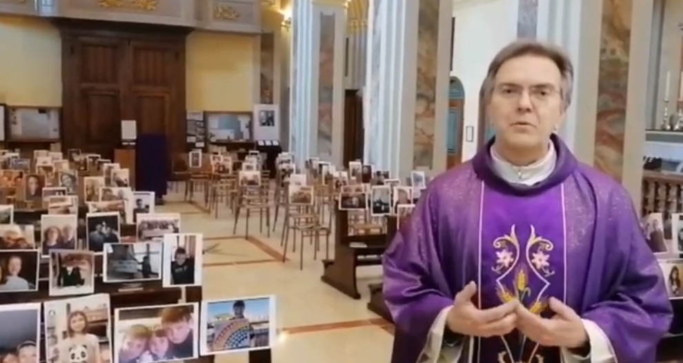 Ιταλός ιερέας δίνει κουράγιο στους πιστούς, προγραμματίζοντας να μεταδίδεται η λειτουργία από το ραδιόφωνο και τυπώνοντας φωτογραφίες πιστών της ενορίας του, με τις οποίες γέμισε την εκκλησία.
