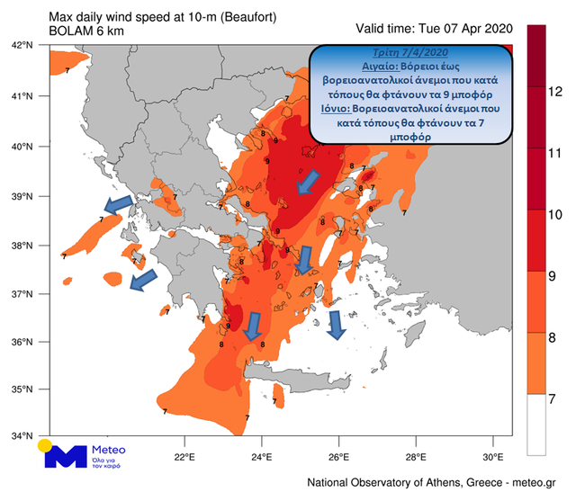 Μέχρι το βράδυ, οι άνεμοι στο Αιγαίο θα πνέουν από βόρειες έως βορειοανατολικές διευθύνσεις 6 έως 8 και τοπικά έως 9 μποφόρ ενώ στο Ιόνιο από βορειοανατολικές 4 έως 6 και πρόσκαιρα κατά τόπους έως 7 μποφόρ. Σταδιακή εξασθένηση των ανέμων αναμένεται την Τετάρτη.