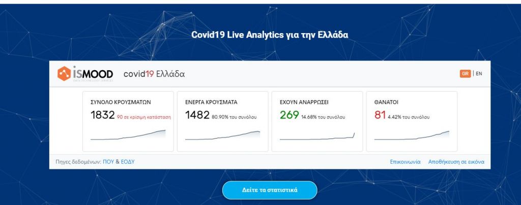 Σύμφωνα με την πλατφόρμα, πίσω από την οποία είναι η εταιρεία ISMOOD, το απόγευμα της Τρίτης η εικόνα του Covid-19 στη χώρα μας έχει ως εξής: