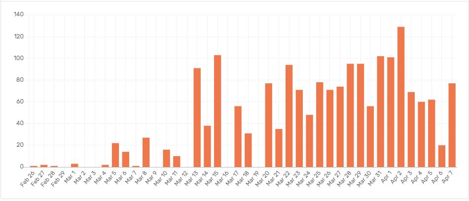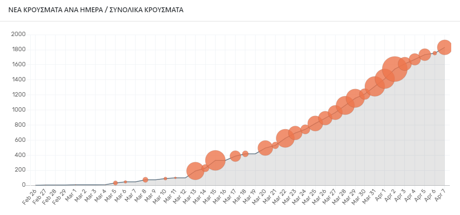 Στο παρακάτω γράφημα, παρουσιάζονται τα καταγεγραμμένα κρούσματα του ιού στη χώρα μας: