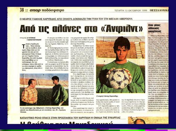 Τη Τέταρτη 13 Οκτωβρίου 1999 η απογευματινή εφημερίδα Θεσσαλονίκη δημοσιεύει ένα χορταστικό ρεπορτάζ για τον «νεαρό Γιάννη Καρυπίδη» που «δοκιμάζει την τύχη του στη Μεγάλη Λίβερπουλ». Τίτλος: «Από τις αλάνες στο Ανφιλντ». Οι δύο συντάκτες που υπογράφουν το «κομμάτι» – Δ. Τάτσικας, Γ. Κωνσταντινίδης- δεν παραλείπουν να αναφέρουν αφενός την ηλικία του Καρυπίδη- μόλις 17 ετών- και αφετέρου την 3χρονη παραμονή του στη σχολή τερματοφυλάκων της Τότεναμ. Ο ίδιος ο Καρυπίδης στο facebook έχει φωτογραφίες από την περίοδο της δοκιμασίας του στο Melwood, στο Liverpool Football Club’s training ground.