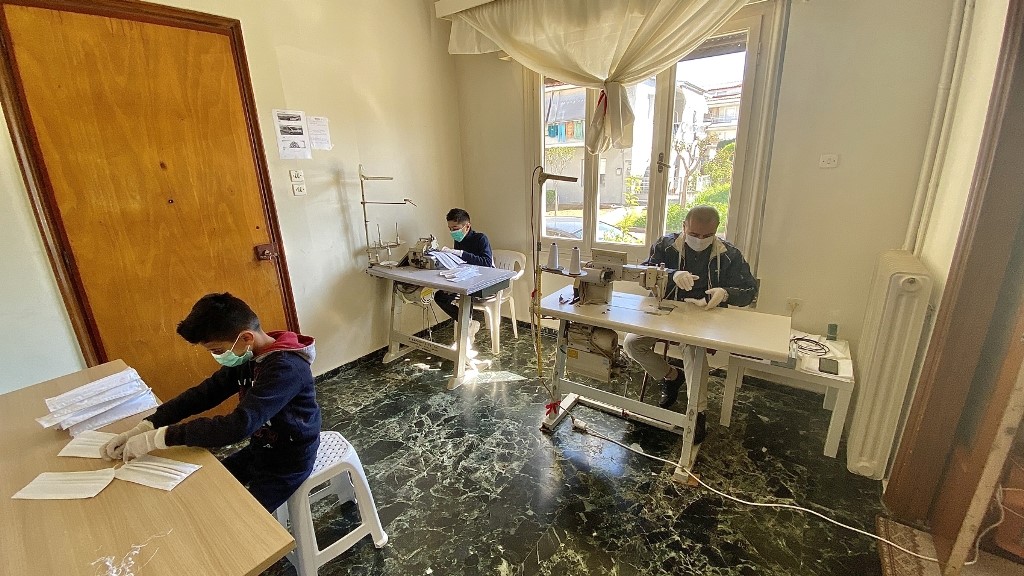 Μάσκες προφύλαξης από τον κοροναϊο, ράβει ένας πρόσφυγας στην Ελλάδα, ο οποίος φιλοξενείται τους τελευταίους μήνες στα Τρίκαλα, μέσω του προγράμματος ESTIA, που υλοποιούν από κοινού η e-trikala (η αναπτυξιακή του Δήμου Τρικκαίων) με την Υπατη Αρμοστεία του ΟΗΕ για τους πρόσφυγες, από το 2017.