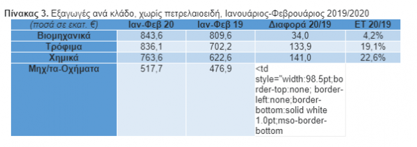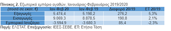 Λαμβάνοντας υπόψη τους δύο πρώτους μήνες του 2020, οι ελληνικές εξαγωγές κινήθηκαν ανοδικά και ανήλθαν στο ποσό των €5.474,4 εκατ., έναντι €5.198,2 εκατ. στο αντίστοιχο διάστημα του 2019, σημειώνοντας αύξηση κατά €276,2 εκατ., δηλαδή 5,3%. Άνοδο σημείωσαν και οι εισαγωγές και συγκεκριμένα κατά €190,8 εκατ., δηλαδή 2,1% με αποτέλεσμα να διαμορφωθούν σε €9.069,3 εκατ., ενώ το εμπορικό έλλειμμα μειώθηκε κατά €85,4 εκατ., δηλαδή 2,3% και ανήλθε σε €3.594,9 εκατ.