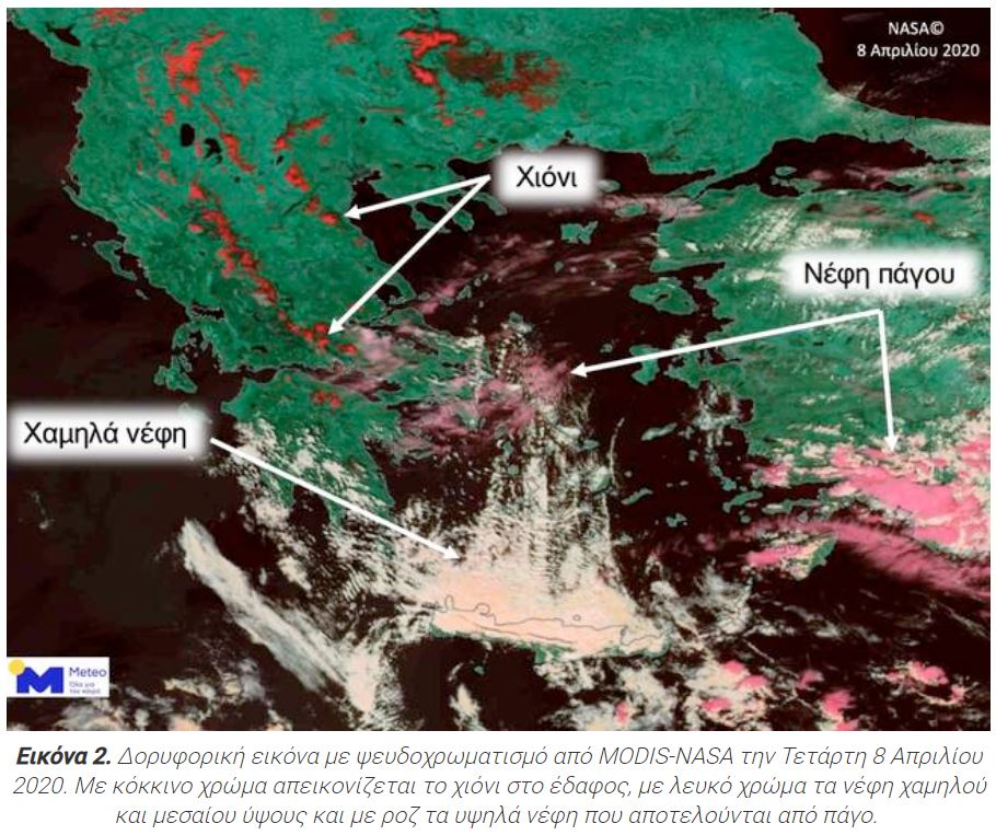 Στις αρχές Απριλίου περίπου το ένα δέκατο (10%) της χερσαίας έκτασης της Ελλάδας βρισκόταν κάτω από φρέσκο στρώμα χιονιού, ποσοστό που ξεπεράστηκε μόλις δύο φορές τον φετινό χειμώνα, με βάση τις δορυφορικές μετρήσεις για την περίοδο 2004 – 2020.