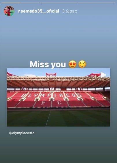 Το ίδιο και ο Ρούμπεν Σεμέδο! Ο Πορτογάλος στόπερ του Ολυμπιακού έκανε μία πολύ όμορφη ανάρτηση, με τη φωτογραφία του Φαληρικού Σταδίου και τη λεζάντα «Miss You», δηλαδή «Μου λείπεις».