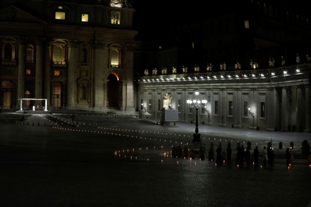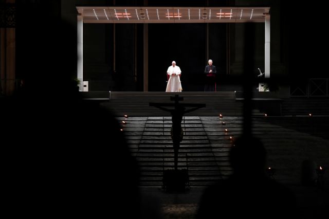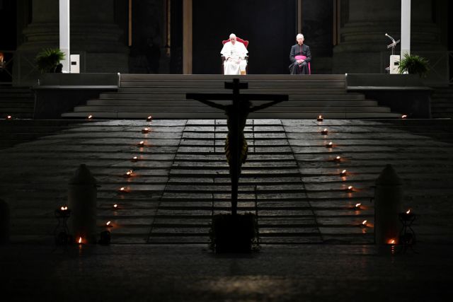 Απόψε ο Πάπας ηγήθηκε της πομπής του Δρόμου του Σταυρού, στα εξωτερικά σκαλιά της Βασιλικής στην άδεια πλατεία του Αγίου Πέτρου.