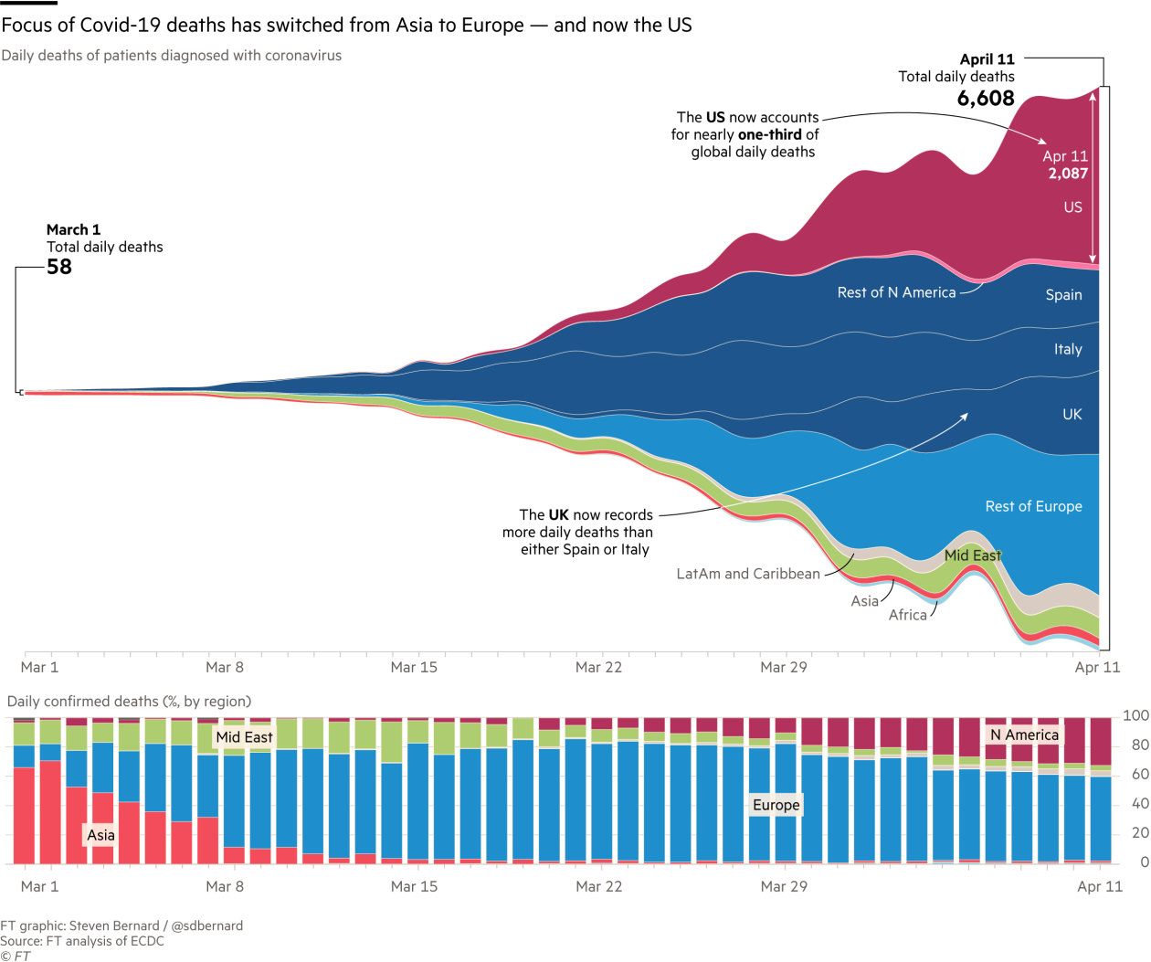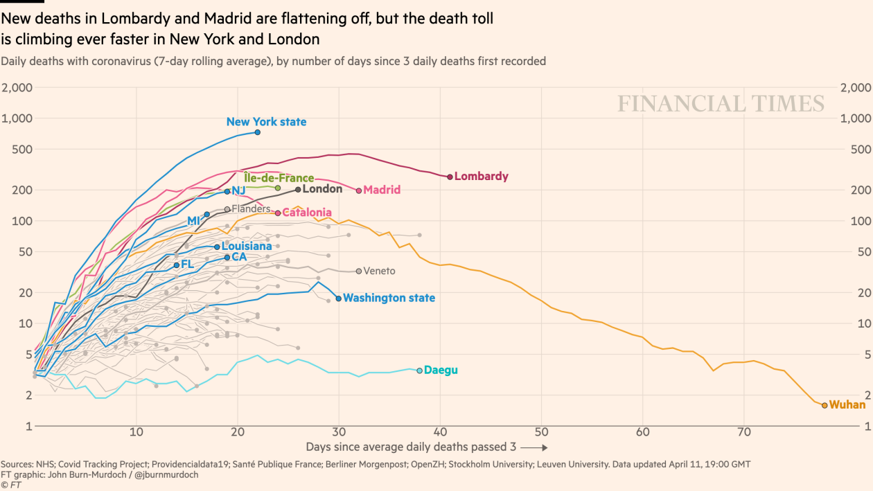 Οι πέντε πρώτες χώρες σε αριθμό θανάτων είναι οι ΗΠΑ (20.580), η Ιταλία (19.468), η Ισπανία (16.972), η Γαλλία (13.832) και η Βρετανία (9.875).