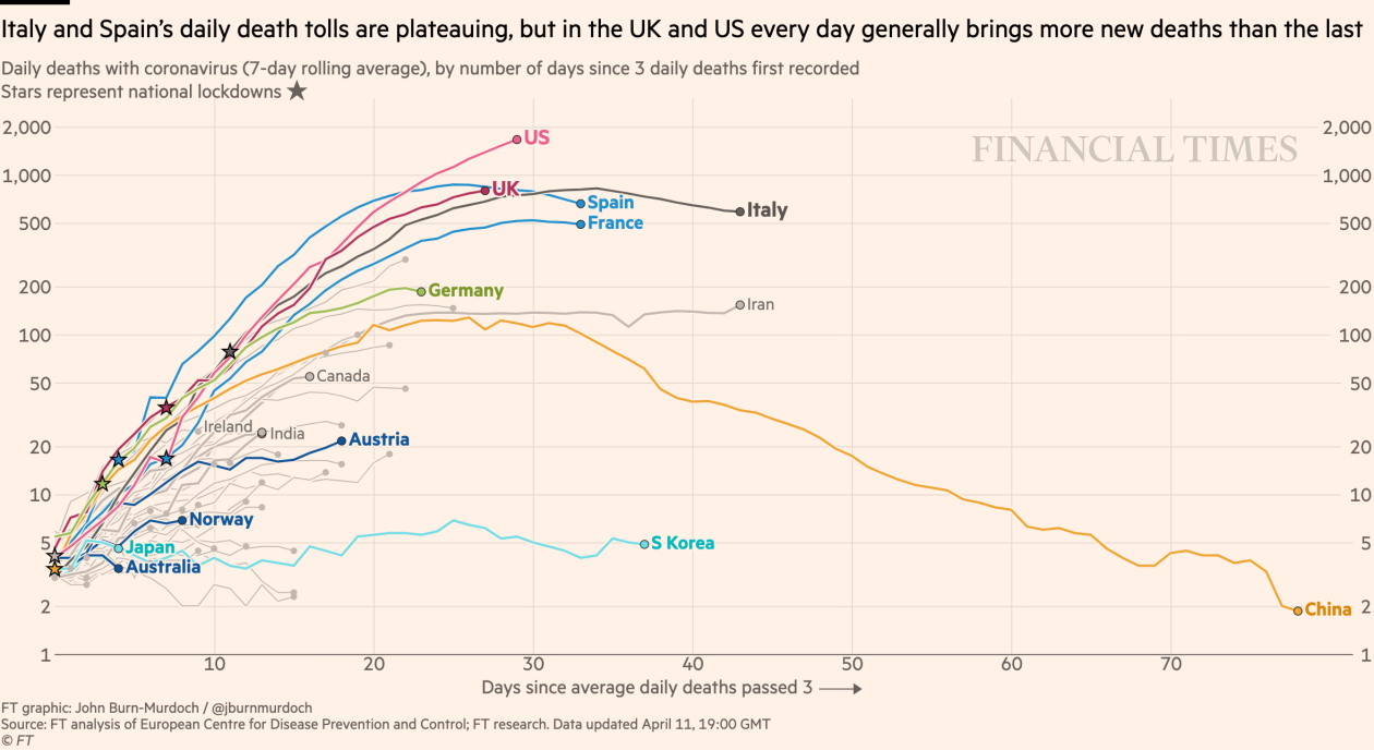 Καθώς Ιταλία και Ισπανία έφτασαν τελικά στο peak της καμπύλης, τα κρούσματα και οι θάνατοι από κοροναϊό σε ΗΠΑ και Βρετανία φαίνεται ότι έχουν εκτροχιαστεί.