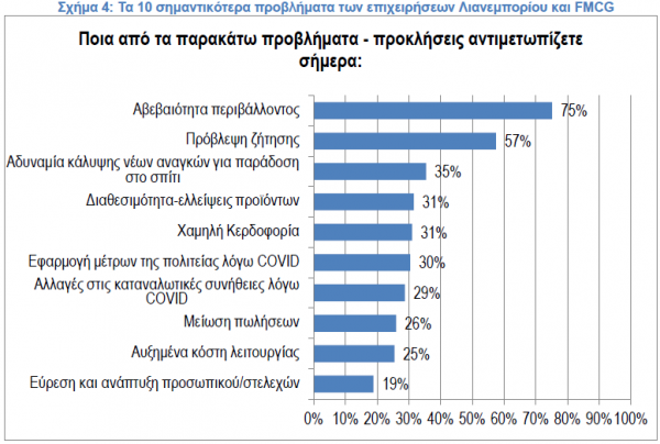 Αντίθετα η αβεβαιότητα περιβάλλοντος που βρισκόταν στην 7η θέση τον Ιανουάριο, βρίσκεται για μία ακόμα φορά στην 1η θέση ως το πιο σημαντικό πρόβλημα του κλάδου, ενώ η πρόβλεψη ζήτησης που δεν είχε απασχολήσει ποτέ την τελευταία 5ετία που πραγματοποιούνται μετρήσεις τα στελέχη ως σημαντικό πρόβλημα, πλέον βρίσκεται στη 2η θέση, ως αποτέλεσμα των απότομων αλλαγών στις αγοραστικές συνήθειες του καταναλωτικού κοινού, καταδεικνύοντας σε ένα βαθμό τα άγνωστα νερά στα οποία βρίσκεται η αγορά.