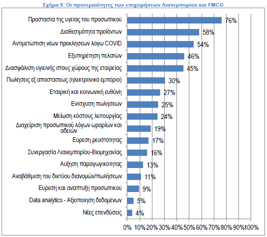 Η διαθεσιμότητα των προϊόντων προς το καταναλωτικό κοινό βρίσκεται ση 2η θέση με 58%. Γενικά κυριαρχούν οι προτεραιότητες γύρω από τις εξελίξεις σε σχέση με τα μέτρα για τον περιορισμό της εξάπλωσης του ιού COVID-19, με 54% η αντιμετώπιση των νέων προκλήσεων λόγω του COVID-19 και η διασφάλιση υγιεινής στους χώρους πώλησης με 45%.