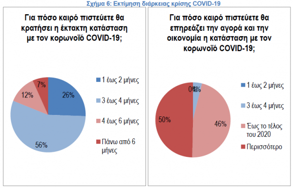 Αυτό εξηγείται και από τις εκτιμήσεις των στελεχών του κλάδου για τη διάρκεια της κρίσης, όπως φαίνεται στο σχήμα 6. Το 74% πιστεύει ότι η έκτακτη κατάσταση με τον COVIC-19 θα κρατήσει πάνω από 2 μήνες, ενώ το 96% πιστεύει ότι η αγορά και η οικονομία θα επηρεάζονται από την έκτακτη κατάσταση έως το τέλος του 2020 ή και περισσότερο, με 1 στα 2 στελέχη να πιστεύει ότι θα επηρεάζεται μετά το τέλος του χρόνου.