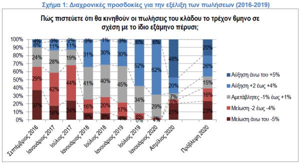 Συνολικά εκτιμάται ότι οι πωλήσεις του κλάδου θα παραμείνουν αμετάβλητες το 2020 σε σχέση με το 2019. Ποσοστό 46% εκτιμά ότι θα αυξηθούν και ποσοστό 39% ότι θα μειωθούν. Πρακτικά αυτό σημαίνει ότι το Β’ εξάμηνο του 2020 αναμένεται να καταγράψει πτωτικές πωλήσεις περί το 2% σε σχέση με το αντίστοιχο εξάμηνο του 2019.