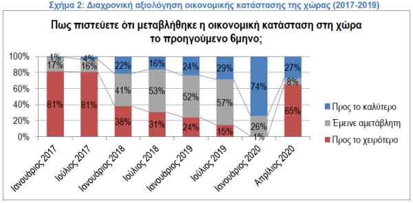 Η θετική τάση που καταγράφηκε στην αποτίμηση της εξέλιξης της οικονομικής κατάστασης της χώρας το 2019 παρουσιάζει πλήρη αναστροφή σε αυτή τη μέτρηση. Συγκεκριμένα, ενώ τον Ιανουάριο 2020 η πλειοψηφία σε ποσοστό 74% θεωρούσε ότι η οικονομική κατάσταση βελτιώθηκε και το 1% ότι χειροτέρεψε, τρεις μήνες μετά το 27% θεωρεί ότι η οικονομική κατάσταση βελτιώθηκε και το 65% ότι χειροτέρεψε. Αντίστοιχα ποσοστά είχαν να καταγραφούν από τον Ιούλιο του 2017.