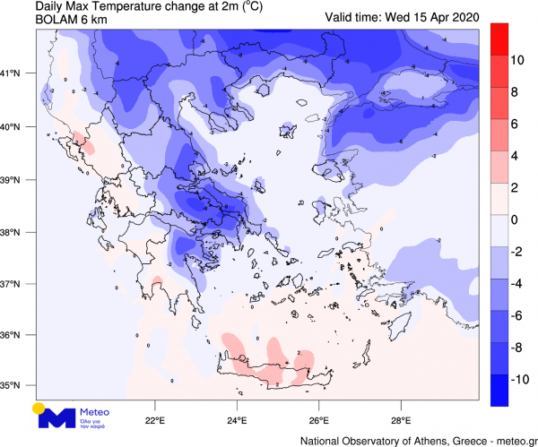 Ένα ψυχρό μέτωπο θα επηρεάσει τον καιρό της Ελλάδας από σήμερα το βράδυ, Μεγάλη Τρίτη 14 Απριλίου, έως το βράδυ της Μεγάλης Τετάρτης, 15 Απριλίου. Η θερμοκρασία θα παρουσιάσει αύριο πτώση, ενώ παράλληλα αναμένεται σημαντική ενίσχυση των ανέμων στα πελάγη, σύμφωνα με τα τελευταία προγνωστικά δεδομένα του Εθνικού Αστεροσκοπείου Αθηνών/meteo.gr.