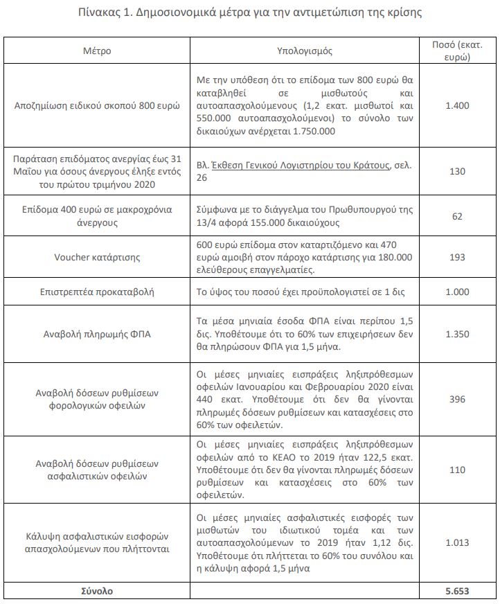 «Σημειώνουμε» επαναλαμβάνουν οι αναλυτές, «ότι οι εκτιμήσεις μας είναι ιδιαίτερα αβέβαιες καθώς η τελική δημοσιονομική επίπτωση των μέτρων εξαρτάται από παράγοντες που δεν μπορούμε να γνωρίζουμε και να ποσοτικοποιήσουμε (αριθμός αιτούντων, διαχειριστική ταχύτητα, ενδεχόμενες παρατάσεις/επεκτάσεις των μέτρων, κλπ.). Συνεπώς τα παραπάνω μεγέθη πρέπει να θεωρηθούν προσεγγιστικά και όχι ακριβή.»