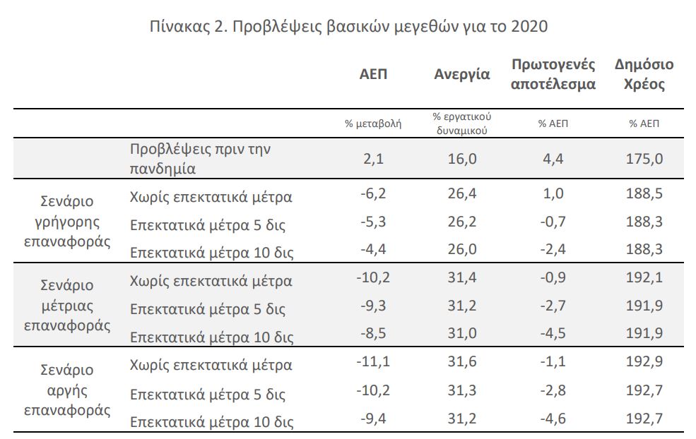 Εξού και εξετάζουν τρία σενάρια, με τα μεγέθη της ύφεσης, της ανεργίας και των δημοσιονομικών αποκλίσεων στο τρίτο χειρότερο σενάριο να είναι τρομακτικά.