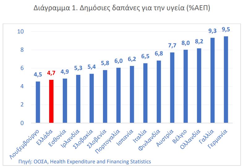 «Τονίζουμε ωστόσο ότι μια τέτοια επέκταση θα πρέπει να είναι στοχευμένη προς την αναβάθμιση των δομών υγείας και τη στελέχωσή τους με προσωπικό και εξοπλισμό. Η Ελλάδα μπορεί να βρίσκεται στις χαμηλές θέσεις στο σύνολο των δαπανών για την υγεία αλλά βρίσκεται στις υψηλότερες θέσεις στις δημόσιες δαπάνες για φάρμακα και αναλώσιμα (1,2% του ΑΕΠ έναντι 1,3% της Γερμανίας που βρίσκεται στην πρώτη θέση).»