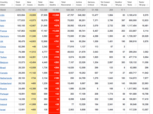 Την ίδια ώρα η φονική πανδημία εξαπλώνεται με τρομακτικούς ρυθμούς. Τα κρούσματα ξεπερνούν τα 2.055.743 ενώ η ανθρωπότητα θρηνεί 133.098 νεκρούς, σύμφωνα με τα στοίχεία του worldometers, το βράδυ της Μεγάλης Τετάρτης.