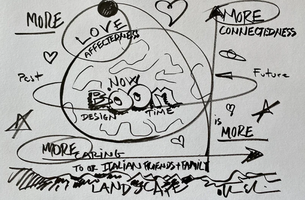 Έχοντας στο κέντρο μια εικόνα του κόσμου, διακοσμημένη με τη λέξη «Boom», το σκίτσο του Ισλανδο-δανού designer μας προτρέπει να αξιοποιήσουμε αυτό το χρονικό διάστημα για δημιουργικότητα, φροντίδα και ικανοποίηση.