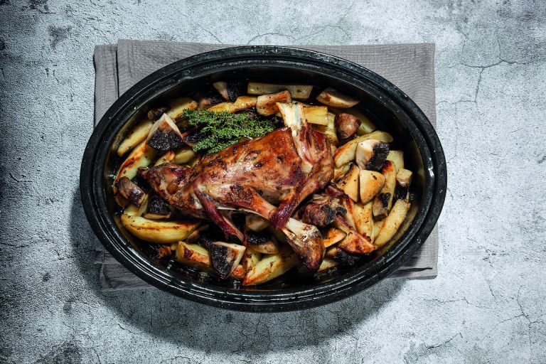 Κατσικάκι στη γάστρα με μανιτάρια και πατάτες