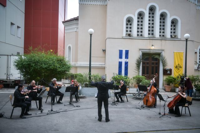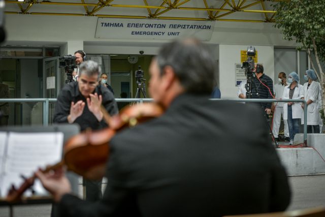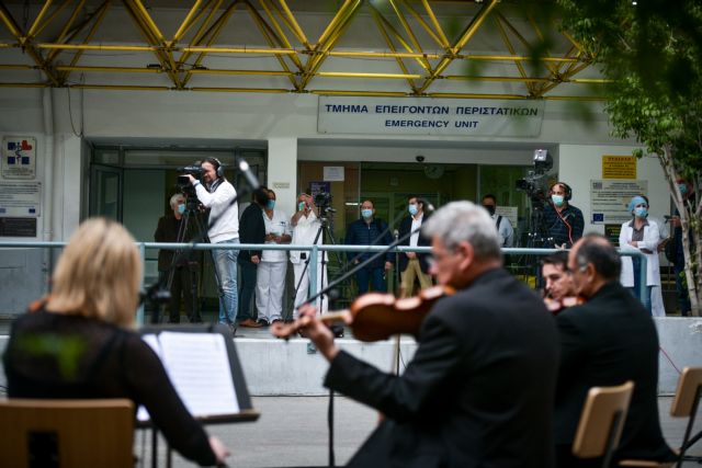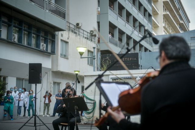 Λαμβάνοντας όλα τα αναγκαία μέτρα προστασίας, οκτώ μουσικοί βρέθηκαν στον προαύλιο χώρο του νοσοκομείου, όπου έδωσαν μια μικρή συναυλία με έργα των Μάνου Χατζιδάκι και Μίκη Θεοδωράκη.