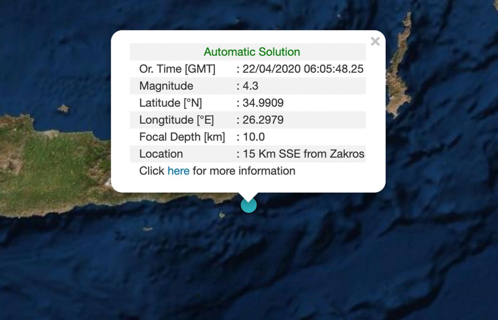 Ο σεισμός στην Κρήτη, σύμφωνα με την αυτόματη λύση του Γεωδυναμικού Ινστιτούτου, έγινε στις 09:05 και είχε εστιακό βάθος 10 χιλιόμετρα.