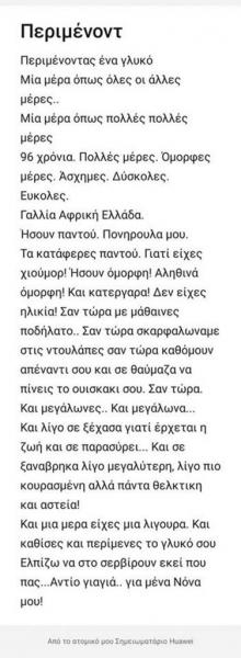 «Περιμένοντας ένα γλυκό. Μια μέρα όπως όλες οι άλλες ημέρες… Μια μέρα όπως πολλές πολλές μέρες… 96 χρόνια. Πολλές μέρες. Όμορφες μέρες. Άσχημες. Δύσκολες. Εύκολες. Γαλλία, Αφρική, Ελλάδα. Ήσουν παντού. Πονηρούλα μου. Τα κατάφερες παντού γιατί είχες χιούμορ. Ήσουν όμορφη. Αληθινά όμορφη. Και κατεργάρα. Δεν είχες ηλικία. Σαν τώρα με μάθαινες ποδήλατο.