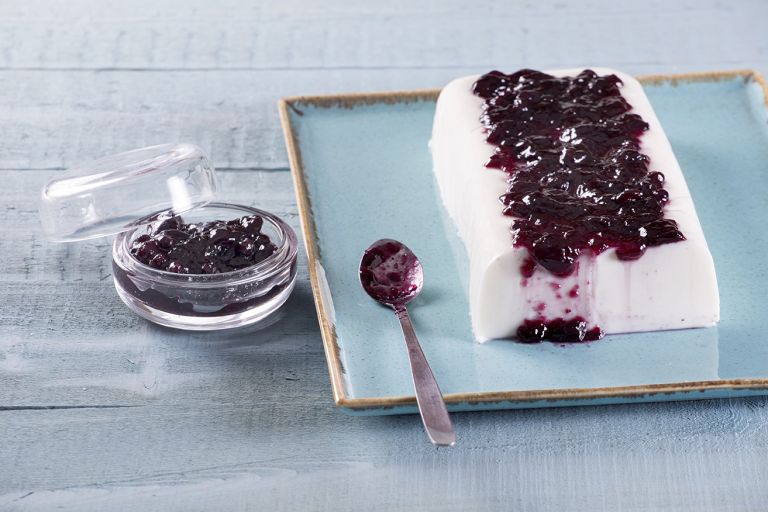 Ρίχνουμε το υπόλοιπο γάλα σε ένα μπολ και το ανακατεύουμε με το γιαούρτι, τη βανίλια και τη στέβια, μέχρι να ομογενοποιηθούν. Προσθέτουμε σιγά-σιγά το ζεστό γάλα και ανακατεύουμε. Ντύνουμε μια φόρμα της αρεσκείας μας με μεμβράνη, έτσι ώστε να εξέχει λίγη από τις άκρες και αδειάζουμε μέσα το μείγμα. Το βάζουμε στο ψυγείο για περίπου 4 ώρες, να πήξει. Σερβίρουμε με τη μαρμελάδα.