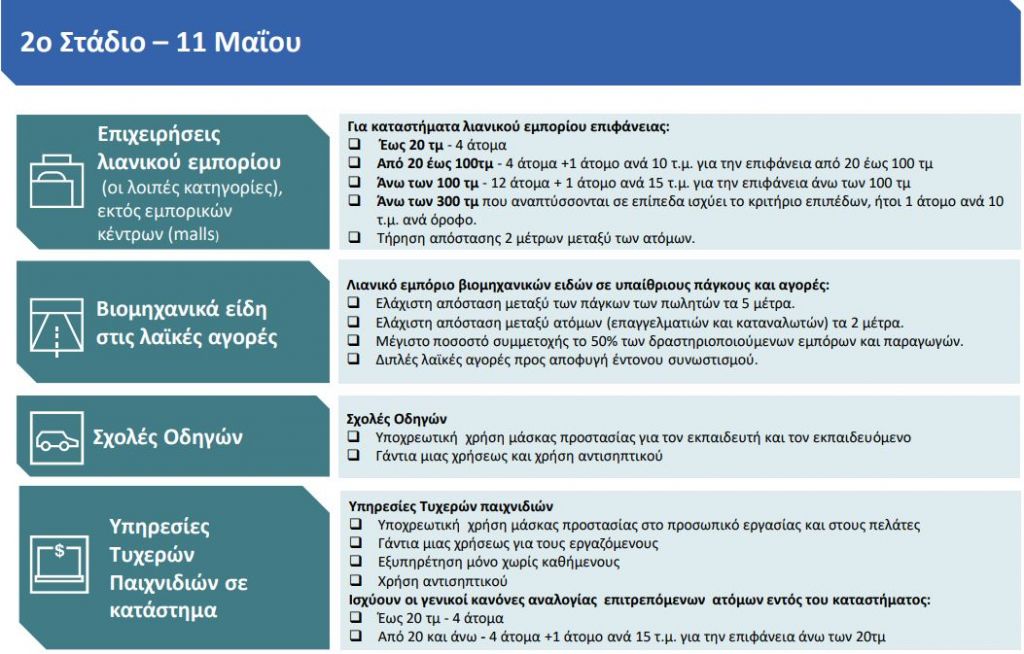 Στις 11 Μαΐου επιστρέφουν όλες οι υπόλοιπες κατηγορίες επιχειρήσεων λιανικού εμπορίου, εκτός των εμπορικών κέντρων (malls), με τους κανόνες ασφαλείας που ισχύουν και για το πρώτο στάδιο.