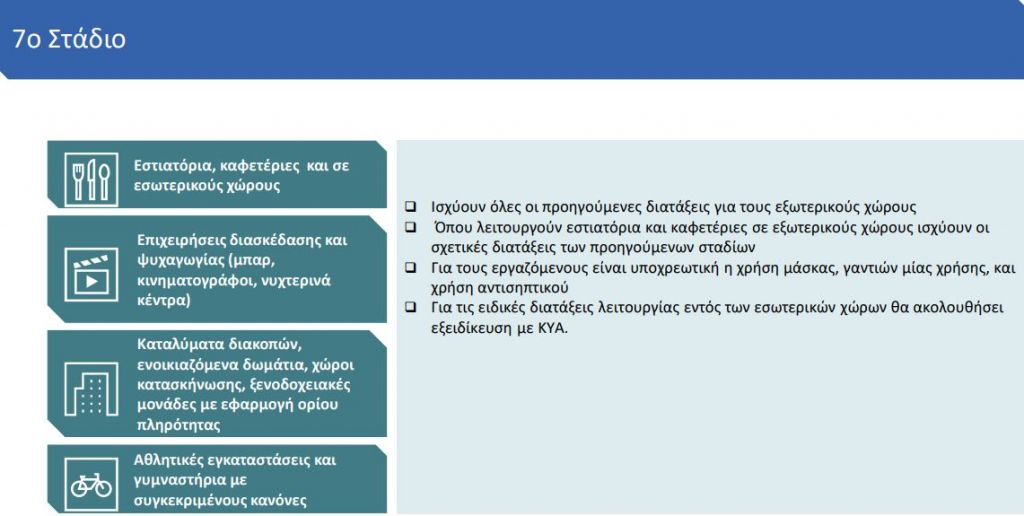 Στο έβδομο στάδιο και τελευταίο, επαναλειτουργούν εστιατόρια και καφέ σε εσωτερικούς χώρους, επιχειρήσεις διασκέδασης, καταλύματα διακοπών και αθλητικές εγκαταστάσεις.