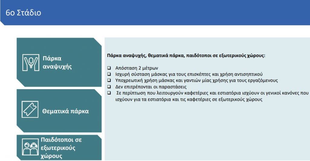Στο έκτο στάδιο επαναλειτουργούν τα πάρκα αναψυχής, τα θεματικά πάρκα και οι παιδότοποι σε εξωτερικούς χώρους, με τους ίδιους κανόνες απόστασης.