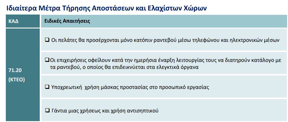 Για τη λειτουργία των ΚΤΕΟ ισχύουν οι ίδιοι όροι προσέλευσης πελατών, δηλαδή μόνο με ραντεβού. Επίσης είναι υποχρεωτική η χρήση μάσκας, γαντιών και αντισηπιτικού από το προσωπικό.