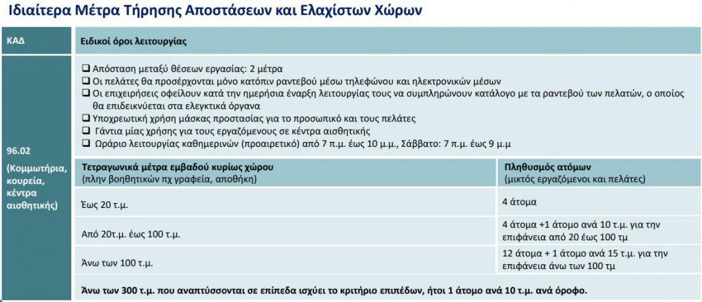 Και για τα κομμωτήρια ισχύουν στο ακέραιο τα μέτρα για την τήρηση αποστάσεων και αποφυγής συνωστισμού, δηλαδή σε κατάστημα έως 20 τ.μ επιτρέπονται έως 4 άτομα, από 20 τ.μ έως 100 τ.μ. επιτρέπονται 4 άτομα + 1 άτομο / 10 τ.μ., κτλ